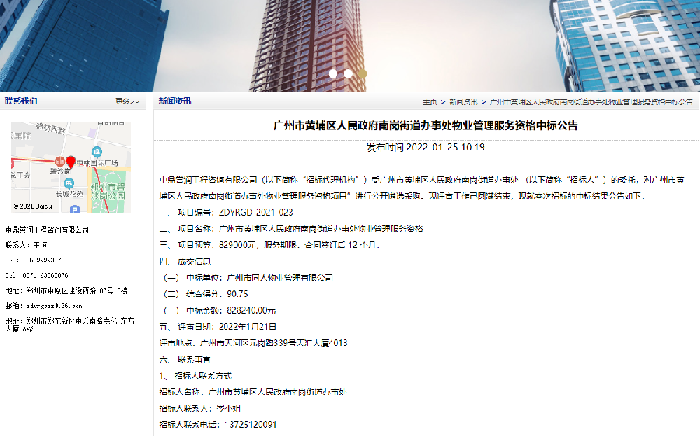 關鍵詞:鼎點娛樂工程咨詢有限公司(以下簡稱“招標代理機構”)受廣州市黃埔區人民政府南崗街道辦事處 (以下簡稱“招標人”)的委托,對廣州市黃埔區人民政府南崗街道辦事處物業管理服務資格項目”進行公開遴選采購。現評審工作已圓滿結束,現就本次招標的中標結果公告如下:一、項目編號:ZDYRGD-2021-023二、項目名[詳細]