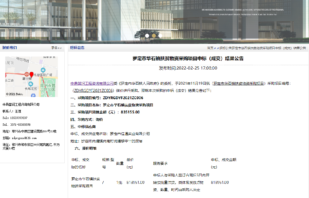 鼎點娛樂工程咨詢有限公司受《羅定市華石鎮人民政府》的委托,于2021年11月19日就(羅定市華石鎮扶貧物資采購項目)采購項目編號:(ZDYRGDYF2021ZC006)詢價進行采購。現就本次采購的中標(成交)結果公告如下:一、采購項目編號:ZDYRGDYF2021ZC006二、采購項目名稱:羅定市華石鎮扶貧物資采購項目三、采購項目預算金額([詳細]